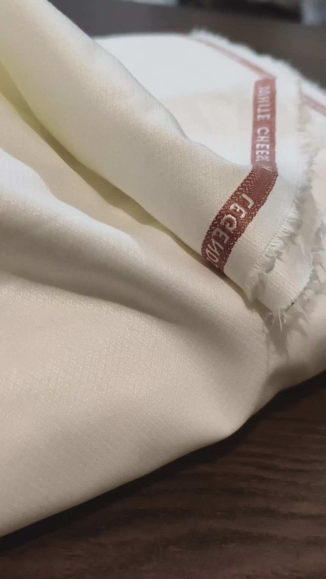 “This fabric features an elegant dobby design and comes in two colors: off-white and cream. Made from viscose, it’s soft, comfortable, and very reliable to wear. From a distance, it appears plain, but up close, you’ll notice its intricate detailing, making it truly beautiful.”